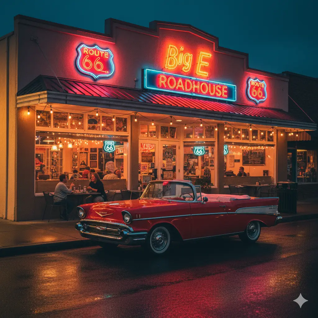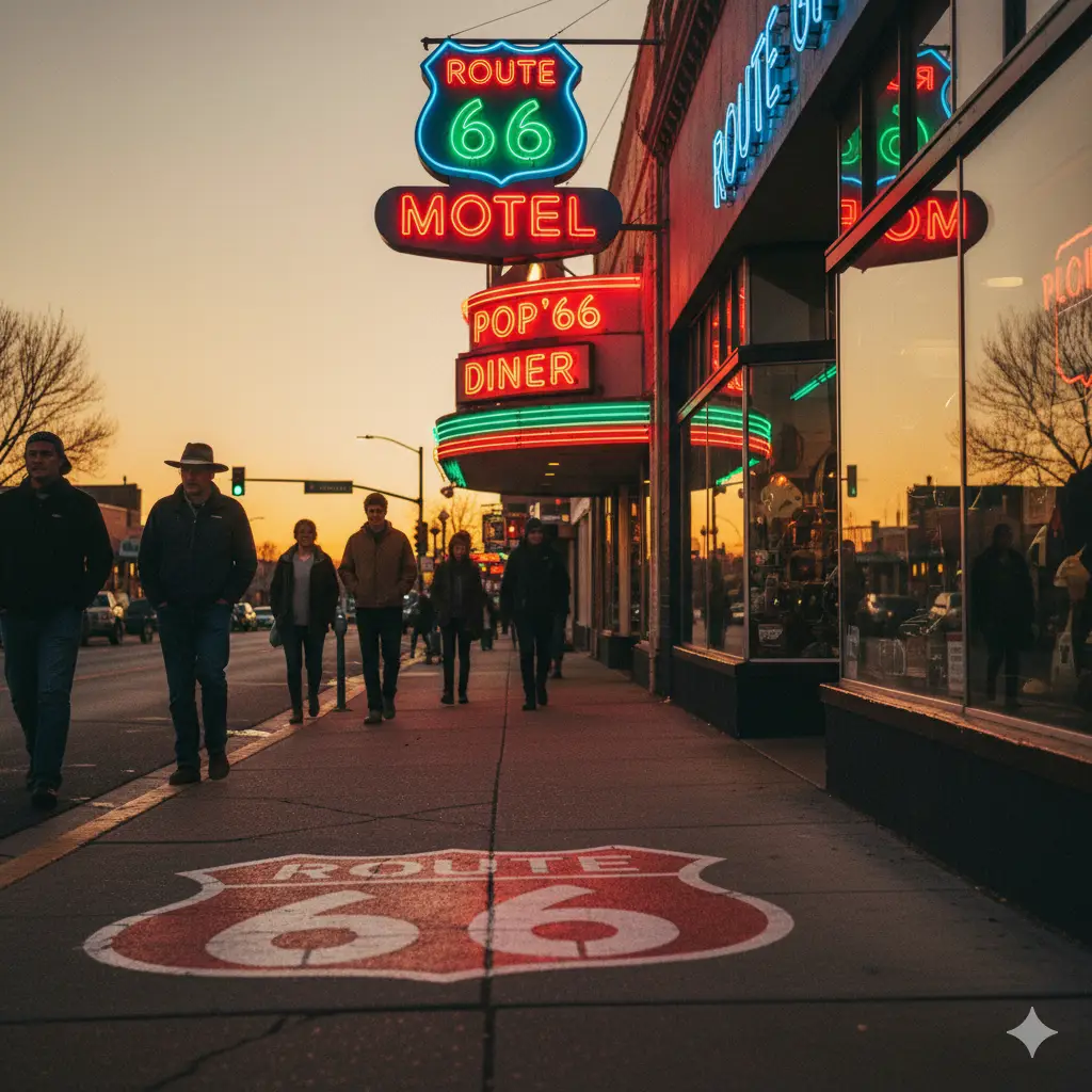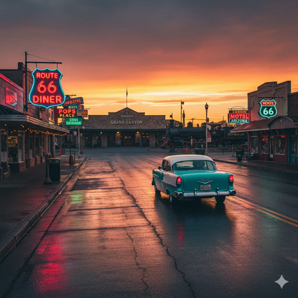 As the sun dips below the Kaibab National Forest, downtown Williams ignites in neon—reds, blues, and greens dancing across the old asphalt. In that glow, you’re standing in 1957.